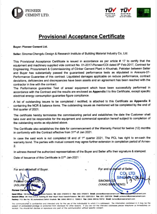 成都建材院总承包的巴基斯坦PCC日产7700吨熟料水泥生产线项目取得PAC证书