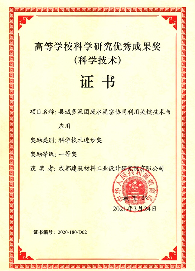 2021 Higher Education Science and Technology Progress Award - First Prize for Solid Waste