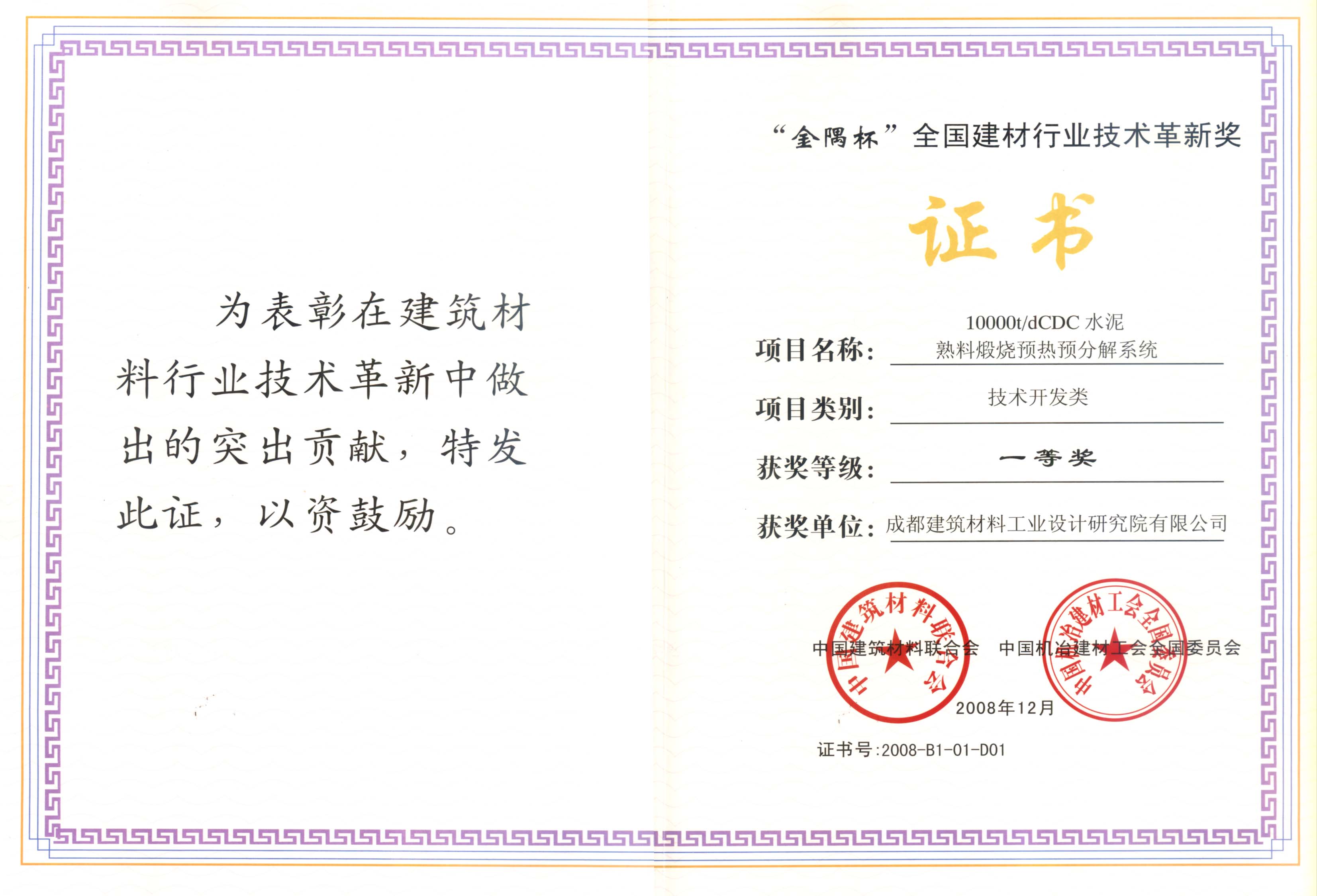 First Prize of 2012 Technology Innovation Award